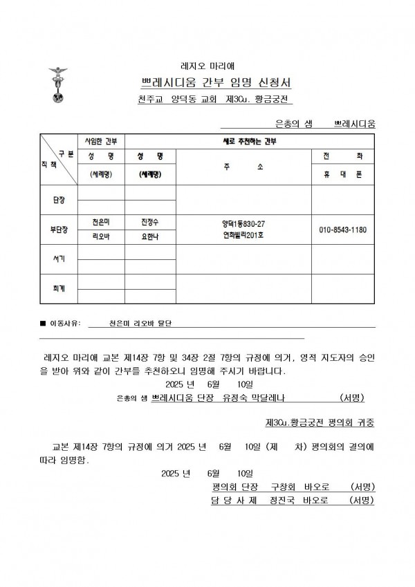 레지오공지 3Cu 간부임명신청서(은총의샘 부단장 변경)