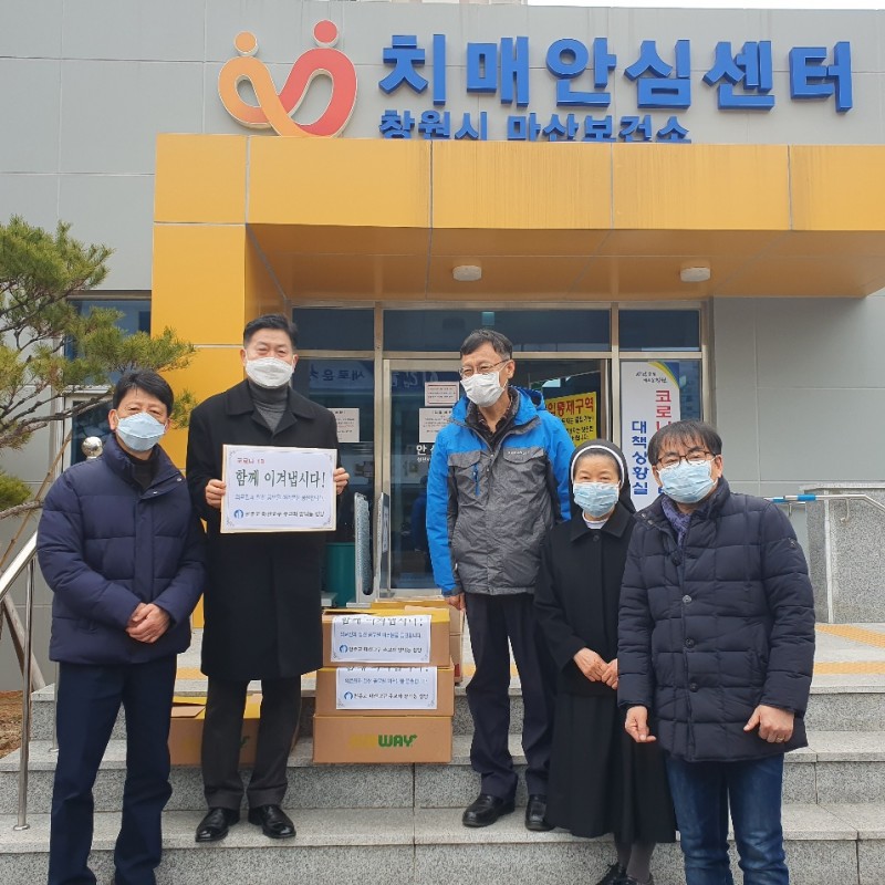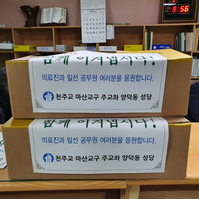 우리성당 신 크레센시아 수녀님과 사목협회 회장단은 2월 28일 토요일 오전 마산보건소를 방문하여 코로나19 방역일선에서 격무에 시달리고 있는 의료진과 관계공무원에게 샌드위치와 음료 등 간식을 전달하고 격려했습니다
